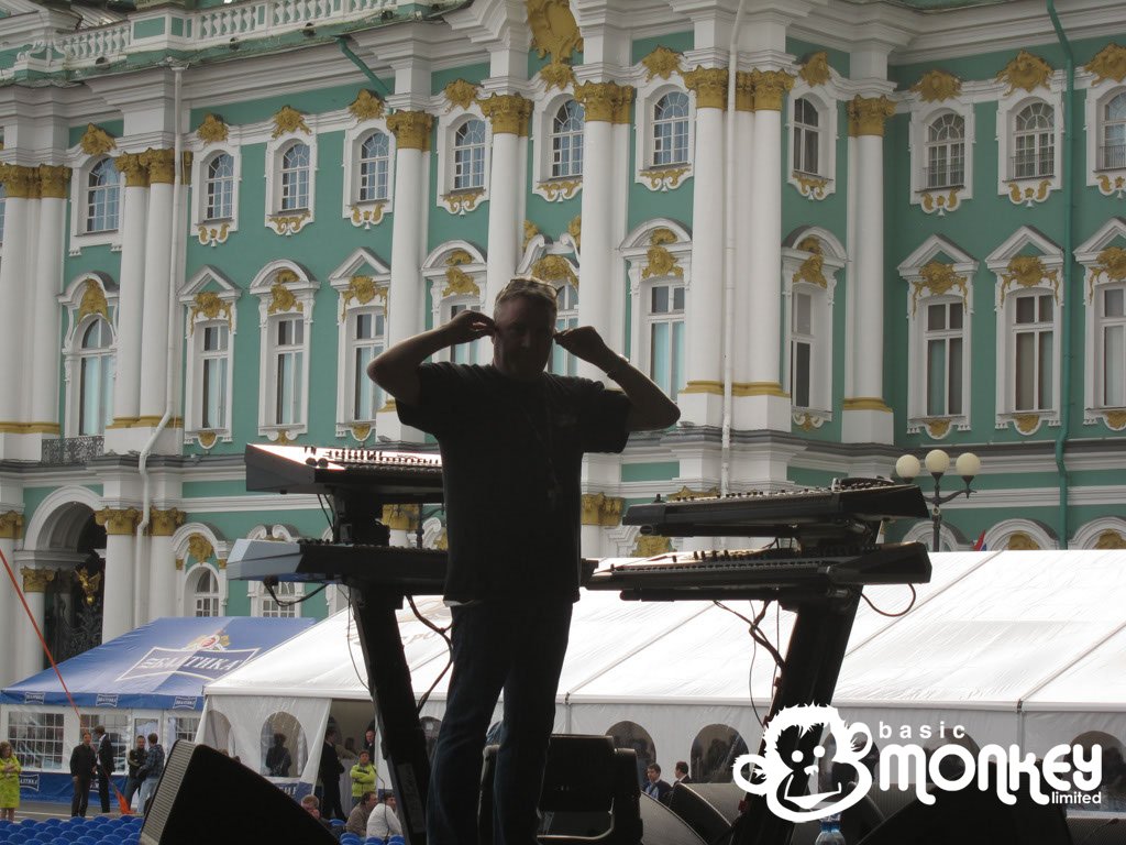 Seeing as there is only about an hour of darkness at this time of year, we could see the magnificence of the courtyard the show was in as soon as we arrived at 2am. Surrounded by dramatic state buildings, the stage looked very out of place. Even more bizarre was the crowd arrangement, with rows of seating in front of stage and the standing area not starting until behind the front of house tower. The event was for the Russian government’s financial event in the city as a treat for the delegates, hence the seating.