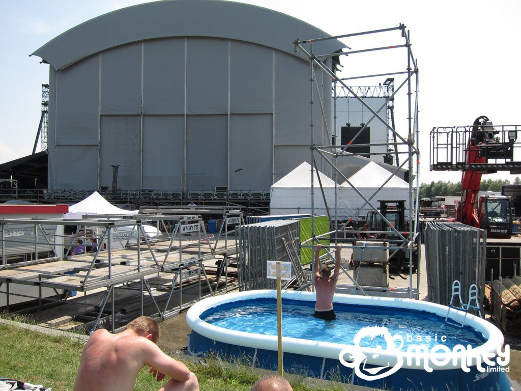 With no more than 3 hours of sleep after Werchter, everyone was a little tired to say the least at 9am, but the load in was made nice and easy by the very capable and friendly local crew. We were done by lunchtime and ready to clear the stage for the support band. This is when we discovered that the production company had built a temporary swimming pool at the back of the stage. Added to this, the local crew with a bit of spare scaffolding, had built a diving board!
