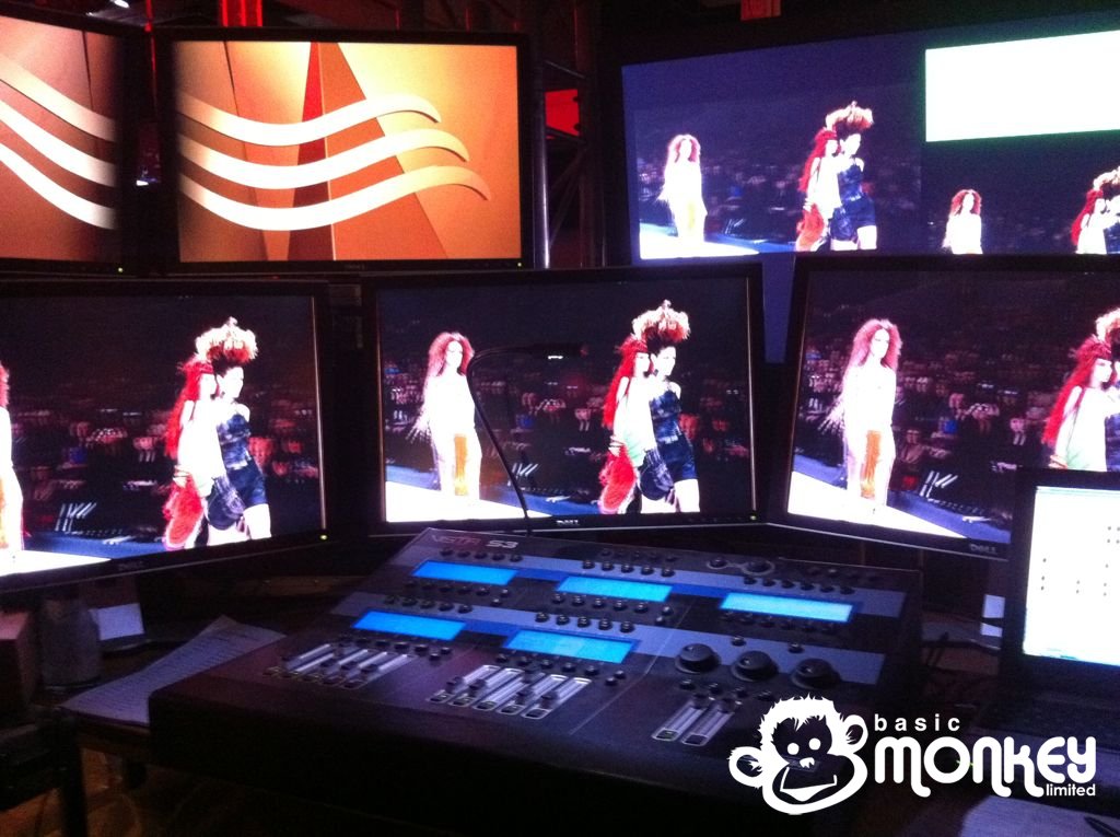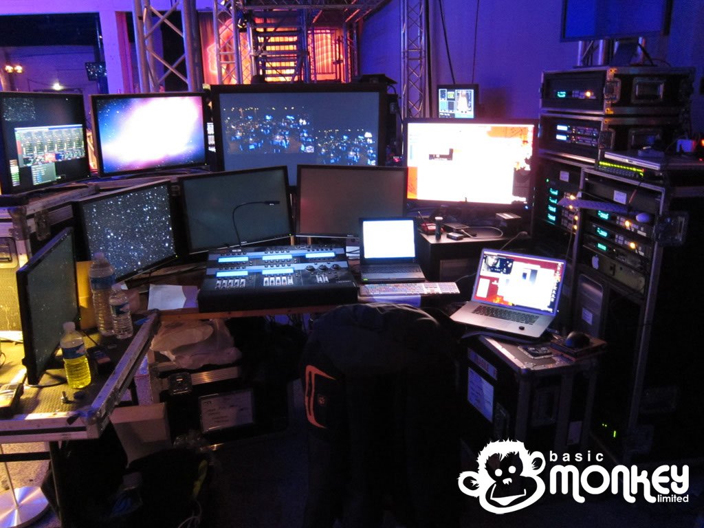 Basic Monkey supplied a Jands Vista S3 system to control the 4x XL Catalyst systems and also our own new 12 core Catalyst system for surround audio playback and video processing. The system involved signal routing which allowed country and studio names to be keyed onto the live webcast at the same time as flags were displayed on the main screen. Live camera feeds were fed into Catalyst to be output to the side screens when not used as part of the trend video intros.